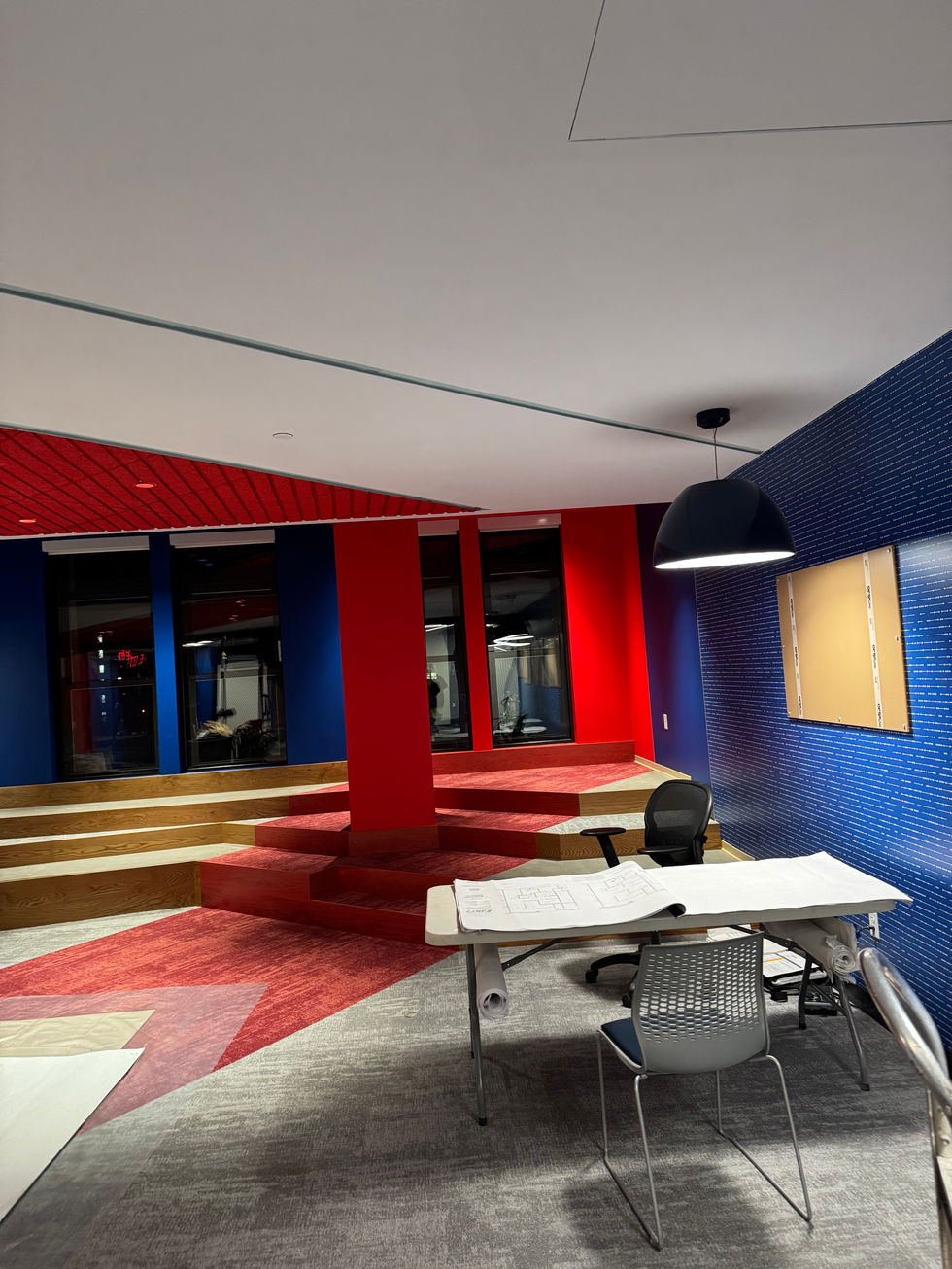 A collection of interior painting projects, showcasing modern hallway with carpet and large windows, colorful hallway with blue and red walls, and modern office space with vibrant red and blue walls.